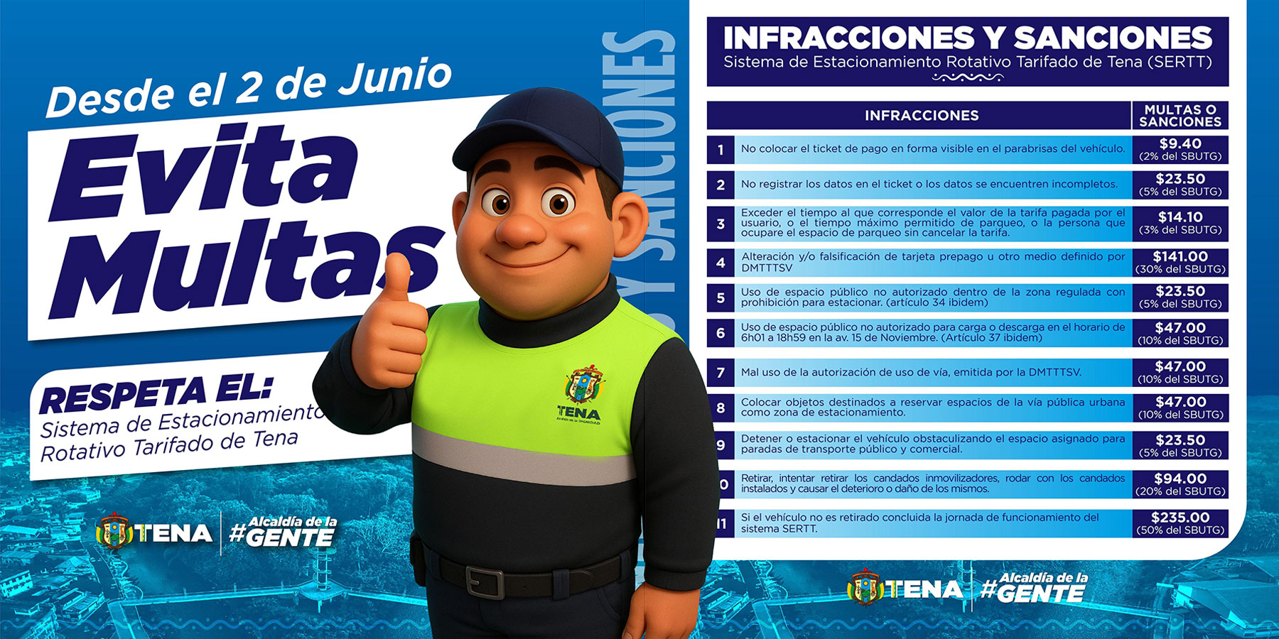 El Gobierno Autónomo Descentralizado Municipal de Tena, comprometido con el desarrollo ordenado y sostenible de la ciudad, implementa el Sistema de Estacionamiento Rotativo Tarifado de Tena (SERTT), con el objetivo de optimizar el uso del espacio público, mejorar la movilidad urbana y fomentar una cultura ciudadana responsable.